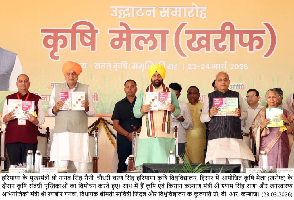 Chandigarh, March 23 — Haryana Chief Minister Sh. Nayab Singh Saini on Monday inaugurated the Kharif Krishi Mela-2026 at Chaudhary Charan Singh Haryana Agricultural University (CCS HAU), Hisar, and appreciated the initiative of bringing farmers, scientists and innovation onto a common platform. He said the soil of Hisar symbolizes hard work, livestock prosperity and the sacrifices of brave soldiers. Rakhigarhi represents the pride of our ancient civilization, while Agroha narrates the story of Maharaja Agrasen’s ideals of social harmony and trade prosperity. Upon arrival at the fair, the Chief Minister first paid floral tributes to the statues of Shaheed Bhagat Singh, Rajguru and Sukhdev on the occasion of Shaheedi Diwas.