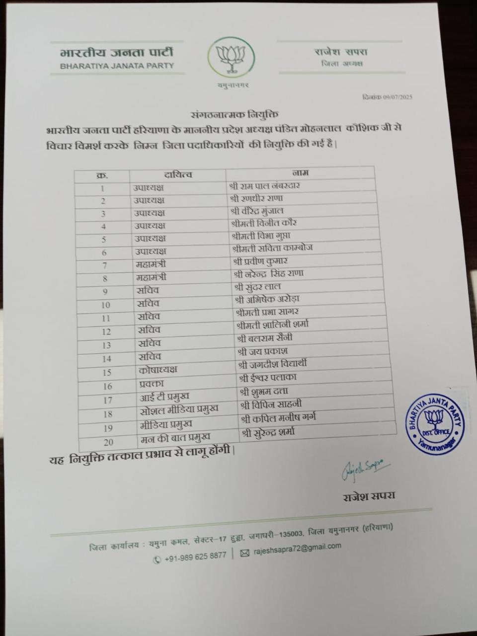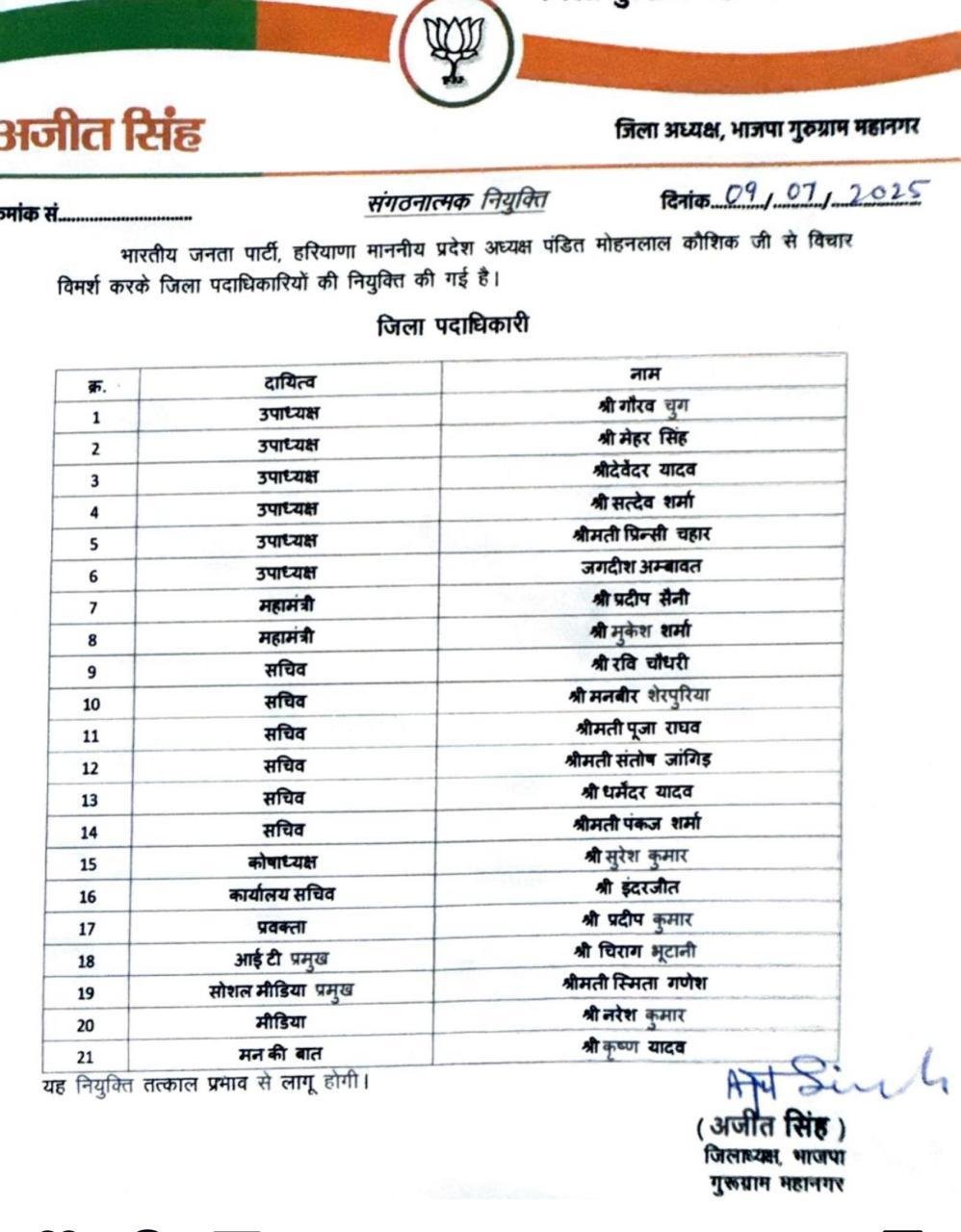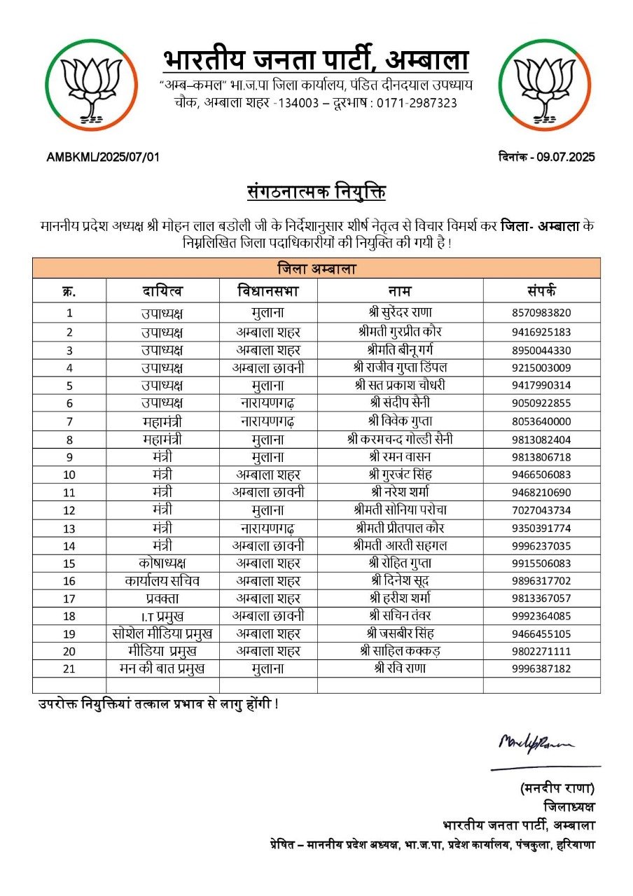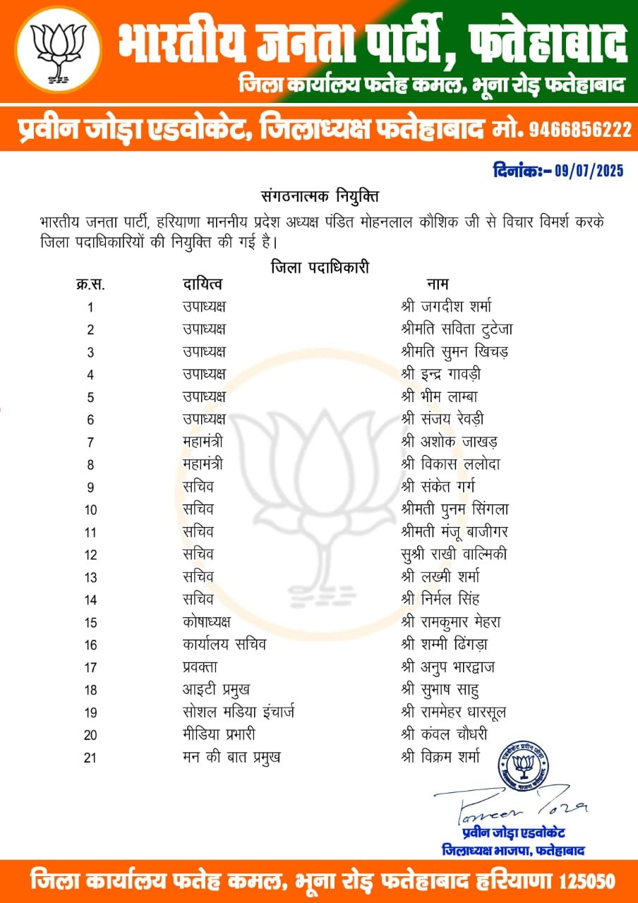Haryana News: हरियाणा में भाजपा ने बड़े स्तर पर संगठनात्मक नियुक्तियाँ की है। देखें पूरी लिस्ट
