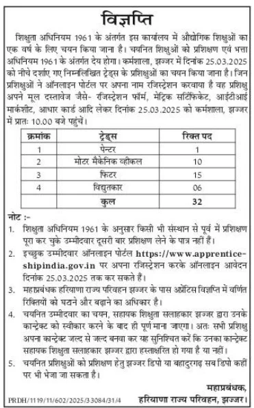 Haryana Roadways Bharti: हरियाणा रोडवेज के झज्जर डिपो में पेंटर, फिटर और अन्य अपरेंटिस पदों के लिए ऑनलाइन आवेदन आमंत्रित किए गए हैं।