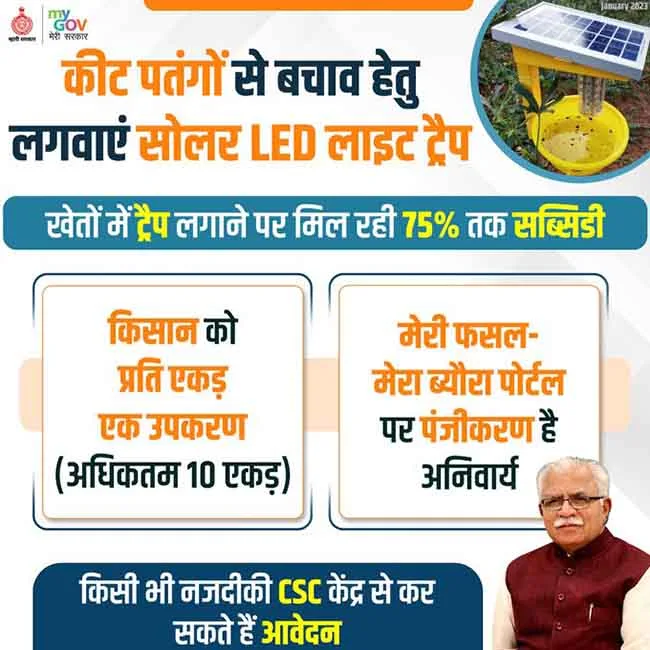 डीसी अशोक कुमार गर्ग ने कहा कि हरियाणा सरकार मुख्यमंत्री मनोहर लाल के नेतृत्व में कृषि एवं किसान कल्याण के लिए कृतसंकल्प है। सरकार की ओर से हरियाणा के किसानों को अपनी फसलों को कीट-पतंगों से बचाने के लिए सोलर एलईडी लाइट ट्रैप पर 75 प्रतिशत अनुदान दिया जा रहा है। इस योजना का लाभ उठाने के लिए मेरी फसल-मेरा ब्यौरा पोर्टल पर पंजीकरण अनिवार्य है। उन्होंने स्पष्ट किया कि योजना के मुताबिक हर एक एकड़ में एक सोलर एलईडी लाइट ट्रैप लगाया जा सकता है। कोई भी किसान अधिकतम 10 एकड़ में लाइट ट्रैप लगा सकता है।
