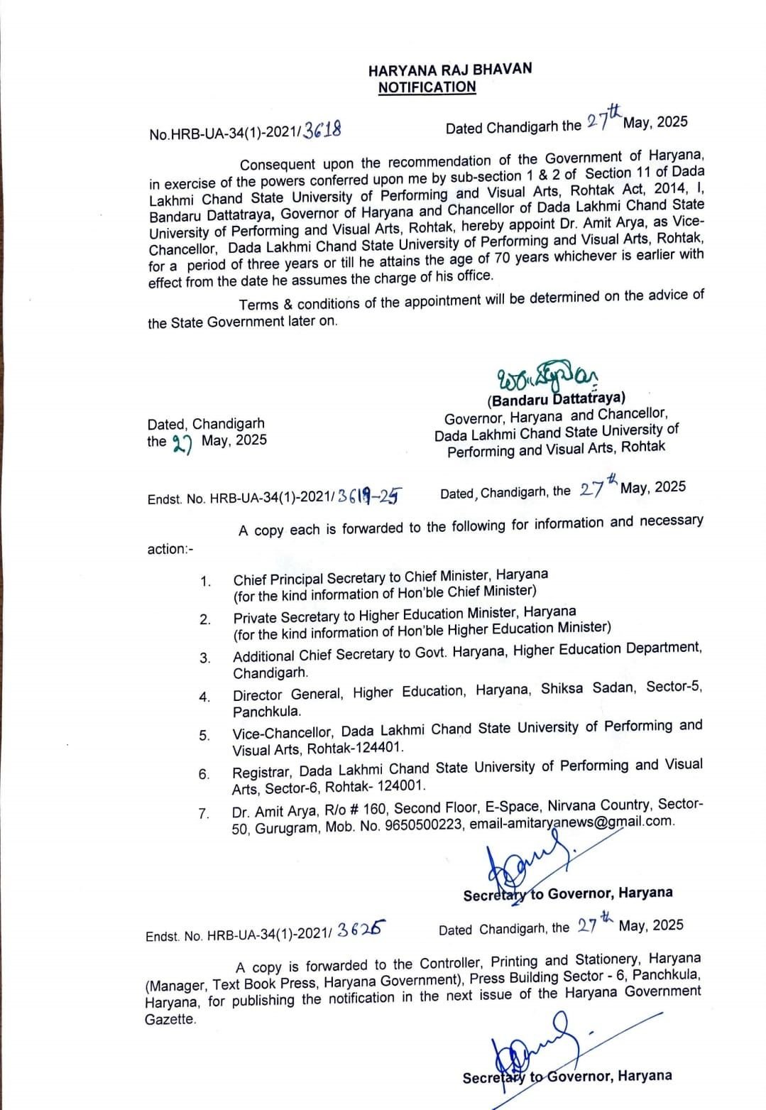 हरियाणा के राज्यपाल बंडारू दत्तात्रेय ने डा० अमित आर्य को दादा लख्मी चंद स्टेट यूनिवर्सिटी के वाइस चांसलर नियुक्त किया।