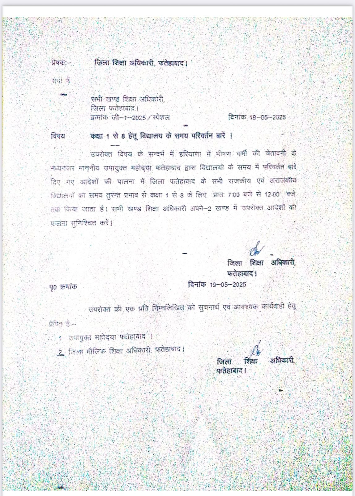 Haryana School Time Change: हरियाणा में भीषण गर्मी ने लोगों को हाल बेहाल कर दिया है। इस भीषण गर्मी को देखते हुए फतेहाबाद जिले में स्कूलों की टाइमिंग में बदलाव किया गया है। अब पहली से 8वीं तक की क्लास सुबह 7 बजे से दोपहर 12 बजे तक लगेगी।