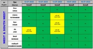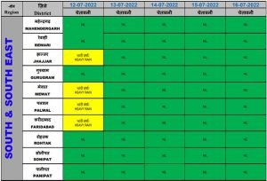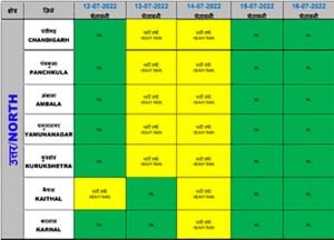 कैथल, झज्जर, मेवात, पलवल, फरीदाबाद, पंचकुला, अंबाला, यमुनानगर, कुरुक्षेत्र, करनाल, फतेहाबाद, हिसार और जींद में बारिश का येलो अलर्ट जारी किया गया है.